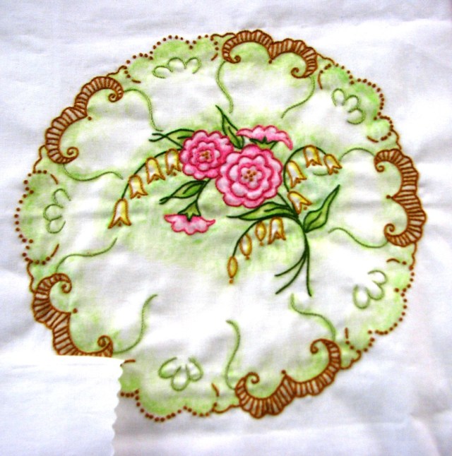 Look at her beautiful hand embroidery.  And she colored in parts of the background.  You’ll have to talk to Sally to get the full story.  Or come to the quilt sho……. you get the picture.