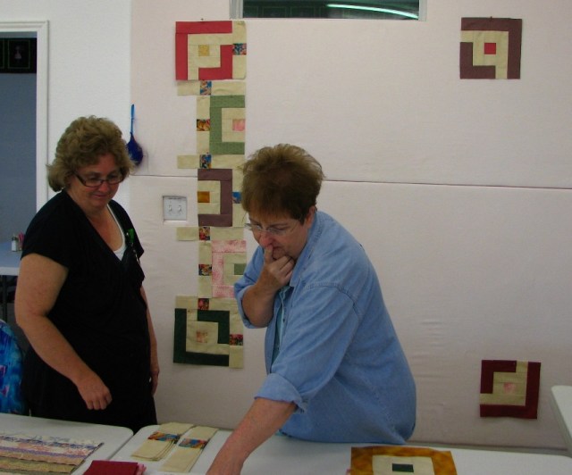 Davene and Karen discuss the laying out of Karen’s quilt earlier at retreat.