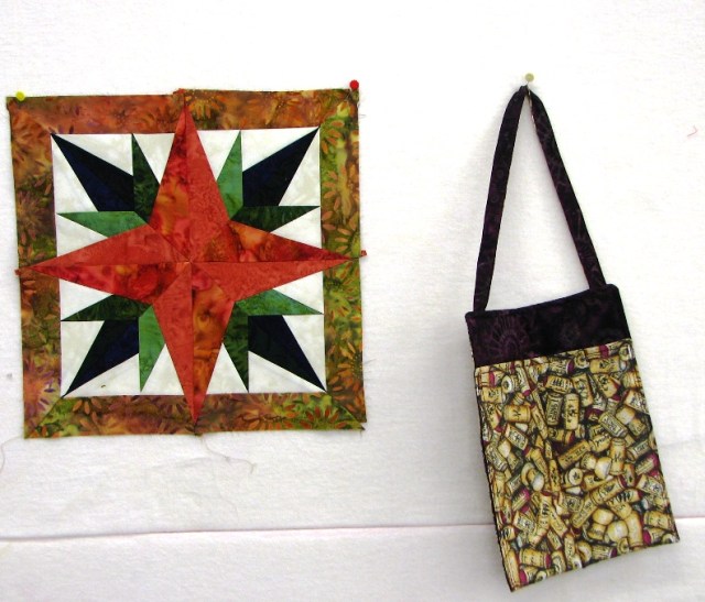 Barbara from San Antonio is working on a paper pieced project and I see that another block has been added to this one too.  Beautiful.  And the little bag on the right is to hang by the bed for the TV remote controls.  It’s made out of wine cork fabric from the CA wine country.  Brought to all of us by LaLa!  Retreat surprises are such fun.