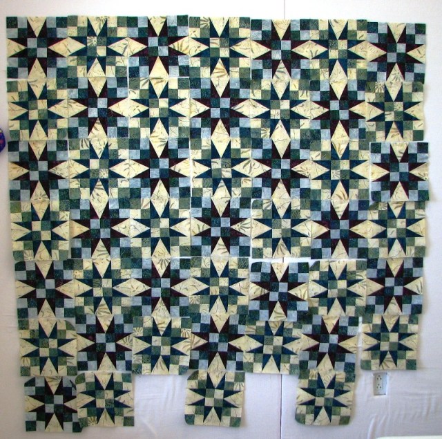There’s a big, huge story attached to this quilt.  Sally is working hard to finish it in time for the quilt show in September.  And it is fabulous.  You’ll have to come to the TVQG Quilt Show (Sally’s in charge) to see the finished product.  I predict it will have lots of ribbons hanging on it.  Big important ribbons.