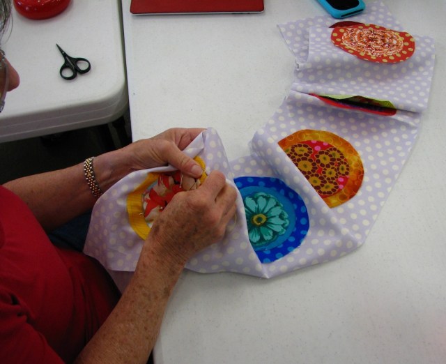 Peggy was also here for way too short a time.  Peggy was here, wasn’t she?  I think I saw her beautiful Kaffe Fassett applique quilt up on the design wall, but I totally missed getting a picture.  How could I?  Peggy, come back!  Or did I just dream she was here?  Wait.  This is Peggy working on the circle borders for that quilt so she must have been here.  If any of you have a nice pic of her quilt, please email it to me and I’ll update with a pic of it here.  In the meantime, picture it gorgeous.
