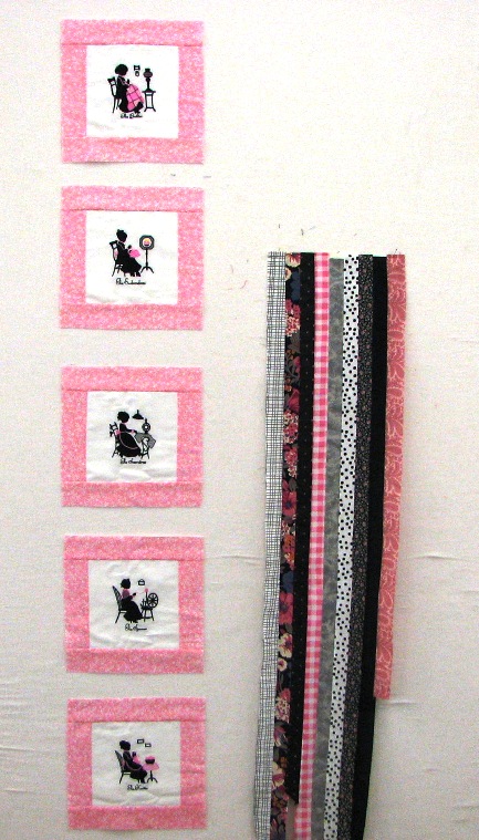 Davene is now working on this cute quilt and the wall is changing faster than I can type.  Those strips on the right are already cut up and being added to the sides in checkerboard fashion on each block.  Picture them fabulous.