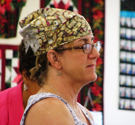 Wine Cork Headwrap.  Dori displays the latest in headwear fashion.  Made from fabric given to us all by a California wine country girl.