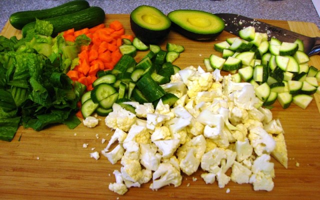 Chop up everything you want to put in your salad.  I use any combination of veggies and fruits that I like.  And I like them all!  This time I used romaine lettuce, cukes, carrots, cauliflower, zucchini and avocado.   You could throw in some diced chicken too.  In other words anything.  Seriously.  Anything you like!  For me, it’s anything I have in the fridge on salad making day.