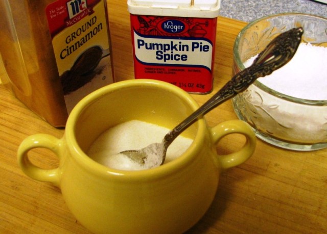 Dry ingredients: cinnamon, pumpkin pie spice, salt and sugar.