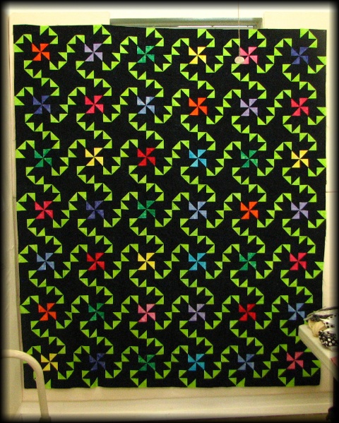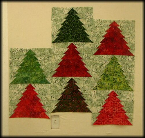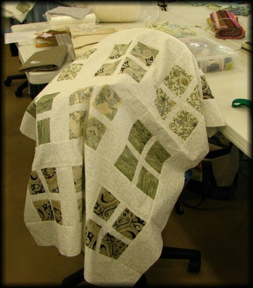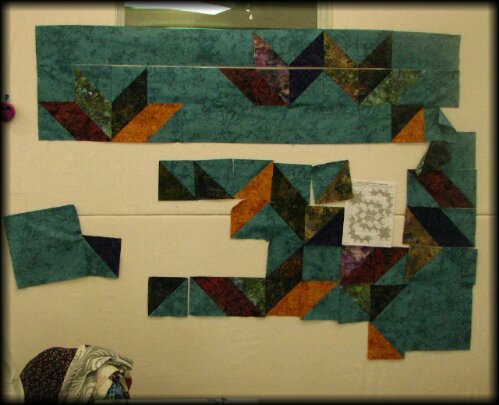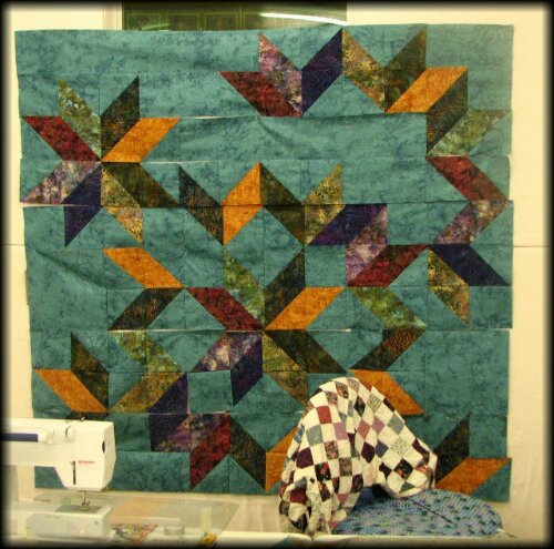 ….that late last night looked like this.  And I see Patti across the room right now stitching this quilt together.  It will be finished any minute now!