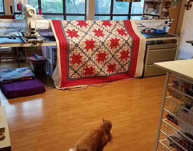 I started this quilt back in the dark ages.  At least 17 or 18 years ago.  And it languished in my sewing room as other projects seemed to get pushed ahead.  Or maybe I just like to start things and not finish them.  Something like that.  Pappy is checking it out.  He’s amazed that I’m finishing quilts too!